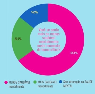 “Publicitários relatam perda de rendimento e saúde mental durante o home office imposto pelas medidas de isolamento social por conta da pandemia do novo coronavírus. As informações fazem parte da pesquisa “Home Office – Tá bom para todo mundo mesmo?” realizada pelo publicitário e pesquisador Lucas Schuch. Entre os publicitários consultados, 65% dizem se sentir menos saudáveis mentalmente; 20% se sentem mais saudáveis; e 14% não perceberam alterações em sua saúde mental. Homens relataram sentir mais sentimentos positivos em relação ao home office, enquanto mulheres relataram mais sentimentos negativos – o que pode estar relacionado ao acúmulo de tarefas domésticas. O levantamento ainda analisa o preparo das agências para adotar o home office, produtividade e cobrança.”